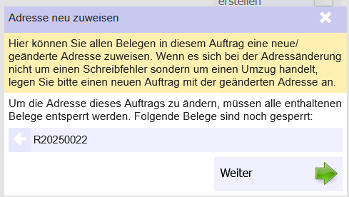 Sollte es in diesem Auftrag bereits geperrte Belege geben, öffnet sich ein weiteres Popup, denn Sie müssen alle gesperrten Belege zunächste entsperren. Eine Übersicht wird Ihnen im Popup angezeigt.